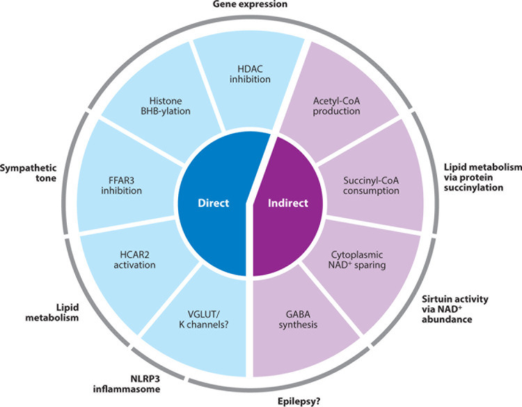 The ketogenic diet has been clinically used for decades to treat epilepsy and currently has a wide range of therapeutic applications, mostly in childhood epilepsies (143). Despite this extensive clinical history, the mechanism of action of the ketogenic diet remains controversial (107). In fact, whether BHB itself is necessary or even active in the therapeutic effect of ketogenic diets is controversial, and the evidence varies between animal models (107). The various possible mechanisms of the antiepileptic effect of ketogenic diets have been reviewed (83, 107). Several of the signaling activities described above may be relevant, particularly modulation of potassium channels, FFAR3 activation, and promotion of GABA synthesis. Epigenetic modifications may also contribute to neuronal hyperexcitability and the long-term effects of epilepsy on the brain through persistent changes in gene expression (112). REST (RE1-silencing transcription factor) is a transcriptional repressor that recruits HDACs, among other chromatin-modifying enzymes, to help silence target genes. REST expression is increased in neurons after seizures and promotes aberrant neurogenesis. However, whether REST activity is helpful or harmful for seizure control differs in different seizure models (112). The contribution of epigenetic modifiers, including those that are modulated by BHB, to epilepsies and their long-term effects requires much further study.