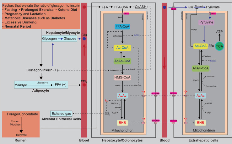 Diagrammatic sketch of endogenous generation and consumption of BHB. Any factors that elevate the ratio of glucagon to insulin, such as fasting, prolonged exercise, insisting on a ketone diet, lactation, diabetes, or alcoholism, can accelerate the process of steatolysis and release lots of FFAs. The released FFAs are transported to the liver by albumin and are condensed with free CoASH in hepatocyte plasma. Then the condensed FFAs are transported into the mitochondrion by CPT1. The forage and concentrate englobed by ruminants are fermented into butyrate by rumen microbes and absorbed by colonocytes. The condensed FFAs and butyrate transported into the mitochondrion of hepatocytes or colonocytes are β-oxidated into Ac-CoA, two of which are further condensed into an AcAc-CoA, releasing a CoASH. The Ac-CoA and AcAc-CoA are then catalyzed to condense into HMG-CoA by mHMGCS2, encoded by a strictly spatiotemporally controlled gene (mHMGCS2). The HMG-CoA is cleaved into Ac-CoA and AcAc by HMGCL. The AcAc is reduced into D-BHB by BDH1 (consuming NADH and releasing NAD+) or spontaneously decarboxylated to volatile acetone and CO2, released into the bloodstream by free diffusion and easily eliminated through the alveolar epithelial cells in the lung. Ac and AcAc are released into circulating blood. The D-BHB is transported across the mitochondrial intima through a yet-unknown mechanism and across the mitochondrial adventitia by SLC16A6 and released into the circulating blood. AcAc and BHB are absorbed by extrahepatic cells. BHB is oxidated to AcAc by BDH1 (consuming NAD+ and releasing NADH, a reversible reaction that also occurs in the generation process of BHB), and AcAc is activated into AcAc-CoA by SCOT1 (succinyl-CoA donates the CoA), and then split into Ac-CoA by mThiolase, consuming CoASH. The glucose derived from the glycogen is transported to and absorbed into the extrahepatic cells by GLUT. In the cytoplasm, the glucose is oxidated into pyruvate by glycolysis, inhibited by the BHB-derived Ac-CoA. Pyruvate is transported into the mitochondrion and then dehydrogenated to Ac-CoA by PDH, inhibited by the BHB-derived Ac-CoA. The BHB and pyruvate-derived Ac-CoA enter the TCA circle or act as signalling molecules.