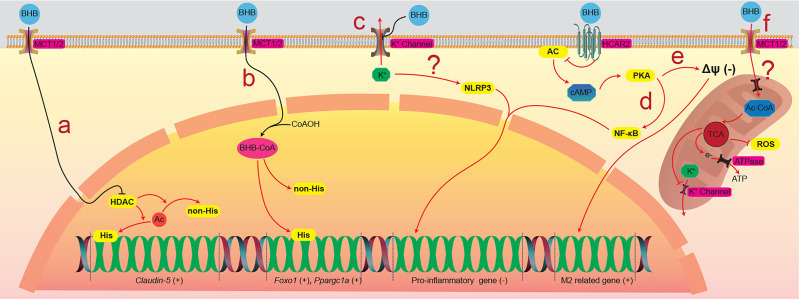 BHB is an endogenous natural small molecule that presents in almost all life realms, connecting glycometabolism, lipometabolism and proteinmetabolism. During its metabolism as energy molecular, NAD+ is oxidated to NADH, the succinyl-CoA is consumed, and lots of Ac-CoA is generated, inhibiting glycolysis and affecting the metabolic environment of extrahepatic cells. Together with its protein and gene modification function, BHB can alter the metabolism, gene expression, and post-transcriptional modification of cells, especially the immune cells. Because BHB is a signal of energy deficiency and a more reductive substrate molecule, elevated blood BHB concentration will guide the body to shut unnecessary physiological processes down, including altering the permeabilities of many endothelium and epithelium to support pivotal processes and reducing the activities of some high energy-consuming cells (plasma cells and goblet cells). These alterations consequently affect the mucosal immune systems, showing great potential in treating mucosal and skin-related diseases. However, the detailed mechanisms and progresses behind these alterations are not fully understood and deserve further investigation.