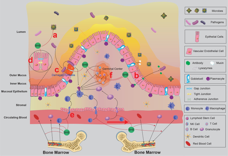 It’s important to realize that these three levels of barriers discussed above are just a part of the mucosal immune system, which also contains the innate immune cells in the stroma from the circulating blood or the germinal centre (Figure 3). Since these innate immune cells are also distributed in other non-mucosal tissues (22, 135), the effects of BHB on these cells were not discussed in this review. Collectively, BHB is an important regulator for the barrier immune system, but these mechanisms are still confusing.