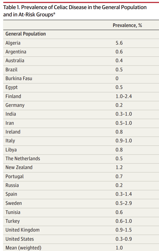 일반 인구에서 셀리악병의 유병률은 1%이며,