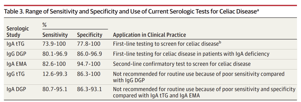 지난 20년 동안 셀리악병 진단을 위한 정확하고 비침습적인 도구의 가용성과 사용이 증가했습니다. 그들의 성능은 최근에 종합적으로 검토되었습니다.44,45 각 검사의 사용과 민감도 및 특이도에 대한 권장 사항은 표 3에 요약되어 있습니다. 실제로, 조직 트랜스글라민화 효소에 대한 혈청 IgA 항체(항-tTG) (또는 IgA 결핍 환자의 경우 IgG 클래스)의 측정은 높은 민감도와 특이도를 가진 우수한 선별 검사 절차이며, 셀리악병이 의심되는 환자에게 가장 먼저 시행해야 하는 선별 검사입니다. IgA 항체 결정은 활성 셀리악병에 대해 98%의 특이성을 보이지만, 비용과 주관적인 해석으로 인해 민감도가 더 다양해질 수 있으므로 확인 검사로서만 사용해야 합니다.44