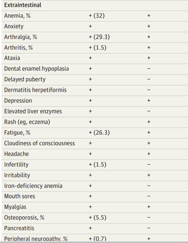 - 비소화기 증상: 철 결핍성 빈혈, 골다공증, 피부염(Dermatitis Herpetiformis), 신경병증(Peripheral Neuropathy)