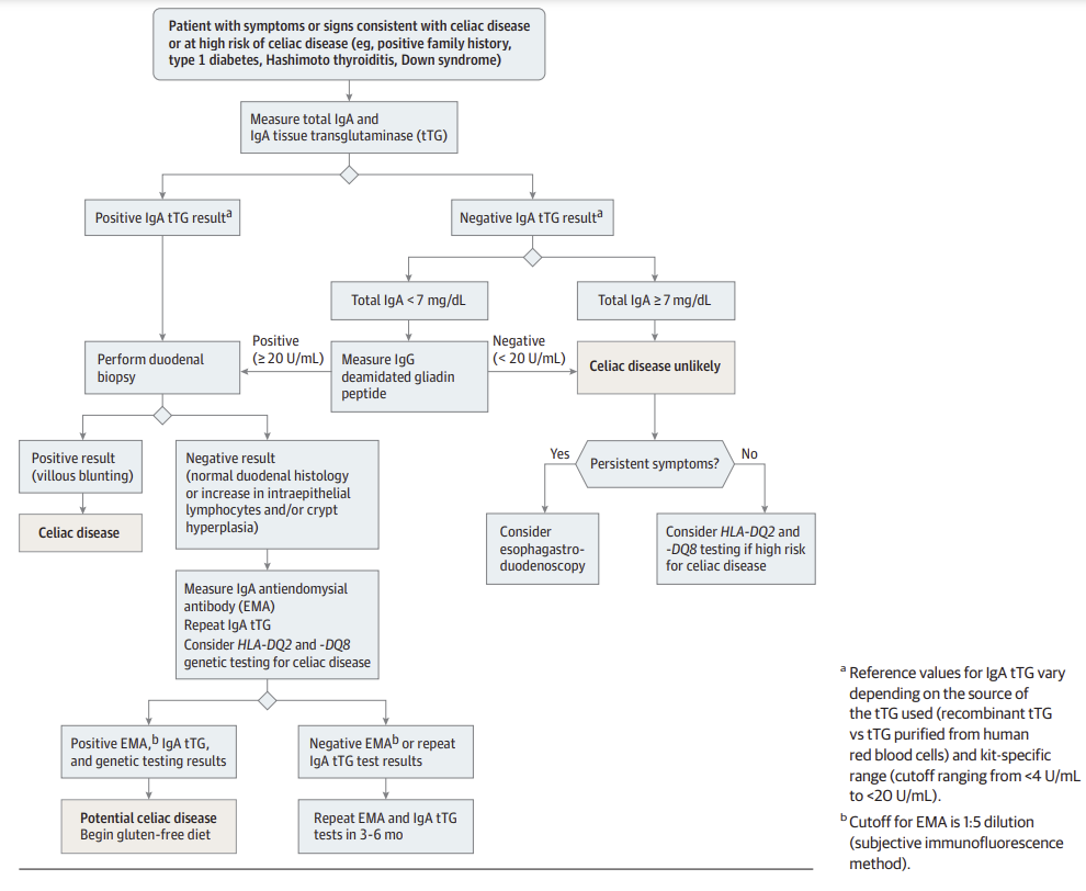 - 혈청 검사: Anti-tTG (IgA, IgG), Anti-EMA 검사
