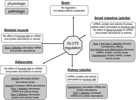 Multiple regulatory parameters of GLUT5 expression and protein abundance and activity under physiological (light shading) and pathological (darker shading) conditions in small intestine, kidney, adipocytes, skeletal muscle, and brain.