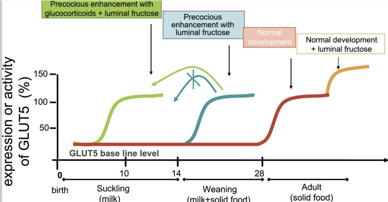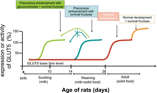 정상 조건(붉은 선)에서 신생 쥐의 수유기(0–14일령)와 젖 떼기 단계(14–28일령) 동안 장 포도당 운반체 GLUT5는 낮은 기본 수준에서 발현됩니다. 젖 떼기가 완료된 후 GLUT5 발현과 활성은 정상적으로 증가하며, 식이 포도당 섭취 증가에 의해 강화될 수 있습니다(주황색). 14일에서 28일령(파란색) 사이에는 장 내강에 프럭토스가 조기 도입될 경우 GLUT5 발현과 활성이 급격히 증가합니다. 14일령 미만의 쥐에서는 장이 데ksametason으로 사전 처리되지 않은 경우 장 내강 프럭토스에 의해 GLUT5가 증가하지 않습니다(녹색).