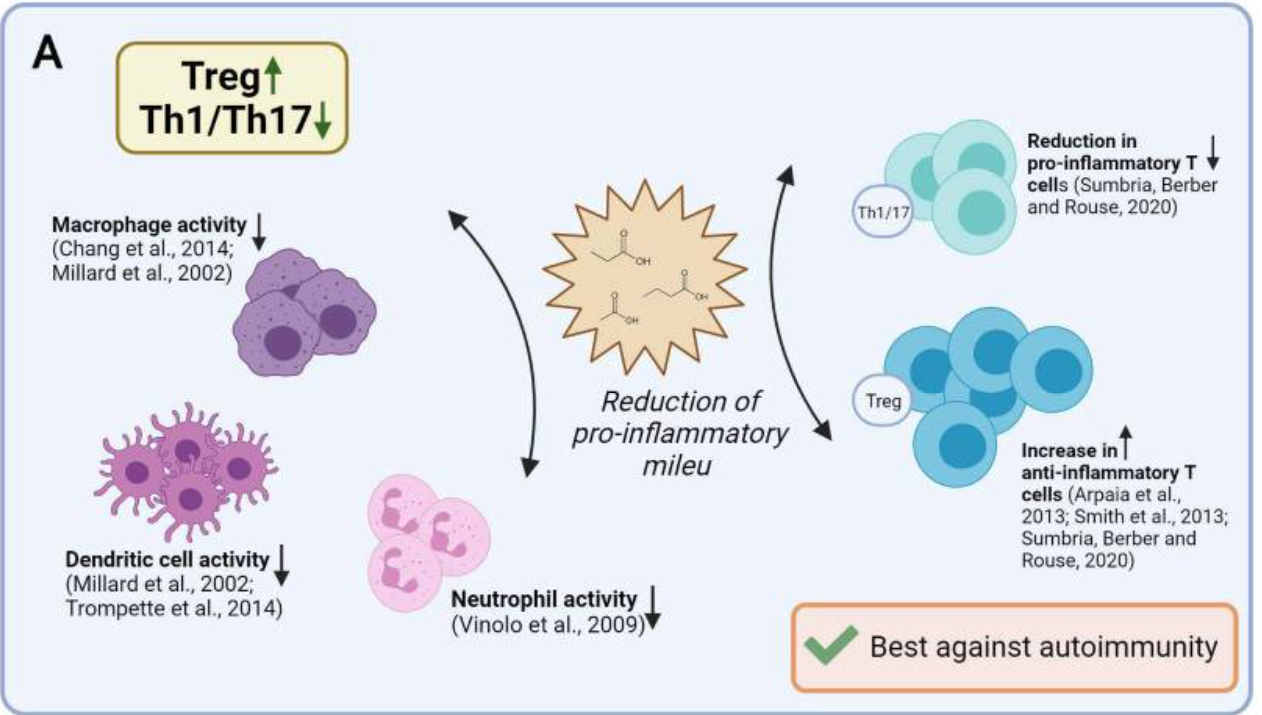 (B) T 세포 배양에 SCFAs를 보충하는 것이 Th1/17, Treg 및 CD8+ T 세포의 기능적 표현형에 미치는 영향 (본문 내에서 설명됨). 참고 문헌이 표시되어 있습니다.