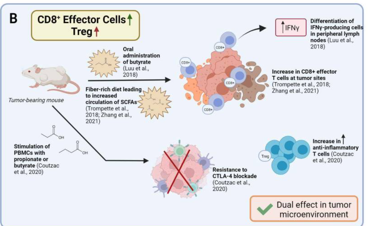 Nevertheless, in a recent study, Coutzac et al observed that, in mouse models of melanoma and in metastatic melanoma patients, high serum levels of butyrate and propionate were associated with resistance to CTLA-4 blockade and a higher proportion of Treg cells. Butyrate supplementation to melanoma tumor-bearing mice in combination with αCTLA-4 restrained DC maturation and the accumulation of both effector and memory tumor-specific CTLs. Likewise, when baseline PBMC samples from metastatic melanoma patients were stimulated with increasing concentration of butyrate ex vivo, there was a correspondent increase in Tregs (summarized in figure 3B).92 Thus, while SCFAs can promote potent CTLs, they can also favor Treg accumulation, and restrain DC maturation.