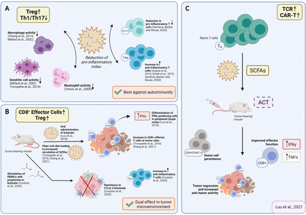 Reported effects of SCFAs on T cell functions in vivo and possible application for ACT strategies. (A) Reported effects of SCFAs in autoimmune manifestations. SCFAs can dampen the pro-inflammatory activities of macrophages, dendritic cells, and neutrophils, and Th1/17 cells, while upregulating anti-inflammatory Treg cells. (B) Reported pro- and anti-inflammatory activities of SCFAs in the context of cancer. Studies in tumor-bearing mice demonstrate that in vivo administration of SCFAs or of fiber rich diets can promote CD8+ T cell effector functions, but also increase the representation of Tregs. This is evidence for SCFAs having counter-regulatory effects according to the disease or the therapeutic setting. (C) Suggested use of SCFA in ACT settings. To take advantage of SCFAs in the context of ACT and overcome possibly pleiotropic effects observed by in vivo administration, preconditioning of T cell product by SCFAs supplementation represents a valuable strategy. ACT, adoptive T cell therapy; SCFAs, short-chain fatty acids.
