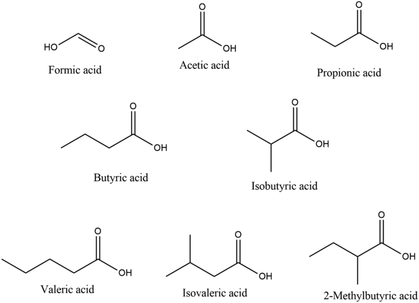 단일 사슬에 최대 5개의 탄소 원자를 가진 포화 단일 카르복시산 지방산입니다.