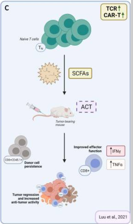 (C) TCR/CAR-T 제조 과정에서 SCFA 활용. 데이터는 SCFA가 전유전자 발현을 연장하고 효과기 기능을 증가시킨다는 것을 지원합니다. CAR, 키메라 항원 수용체; HADS, 히스톤 탈아세틸화 효소; SCFAs, 단쇄 지방산;