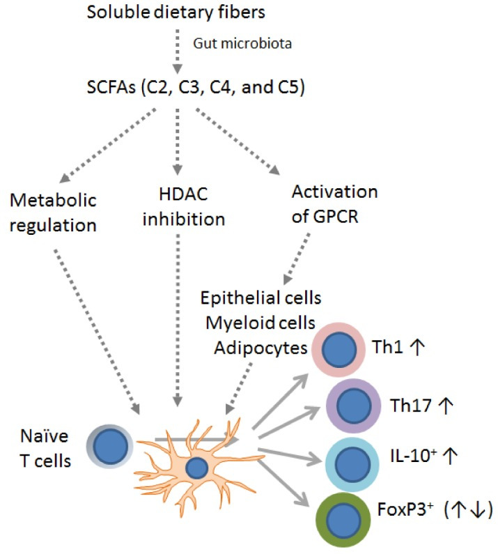 SCFAs에 의한 T 세포 조절. SCFAs는 대장에서 혐기성 미생물에 의해 식이 재료의 발효 산물로 활발히 생성됩니다. 대부분의 탄수화물과 단백질은 위와 소장에서 완전히 소화되고 흡수되며, SCFAs를 효율적으로 생성하지 않습니다. SCFAs는 주로 대장에 도달해 미생물에 의해 처리되는 소화 저항성 식이 섬유에서 주로 생성됩니다. SCFAs는 대장 상피세포로 흡수되거나 운반됩니다. 이들은 대장 상피세포에서 대사되거나 혈액 순환으로 운반되어 간, 근육 등 다른 장기로 이동합니다. SCFAs는 상피세포, 항원 제시 세포 및 T 세포에 조절 효과를 발휘합니다. 이 과정에는 대사 조절, HDAC 억제, GPCR 활성화 등 다양한 메커니즘이 관여합니다. 이러한 활성화 신호는 직접적 또는 간접적으로 T 세포 분화를 조절합니다. SCFAs의 T 세포에 대한 직접적 효과는 적절한 사이토킨 조건에서 Th1 및 Th17 세포의 생성을 촉진하며, 이는 병원체와 싸우는 면역력을 강화하는 데 중요합니다. SCFAs는 염증 반응을 예방하는 데 중요한 IL-10의 T 세포 생산을 효율적으로 촉진합니다. 특정 활성화 조건에서 SCFAs가 FoxP3+ T 세포를 확장시킨다는 보고가 있습니다. SCFAs는 발달 중인 DC에 조절 효과를 발휘하여 항원 및 사이토킨을 효과기 T 세포에 제시하는 능력이 제한된 DC를 생성할 수 있습니다. 이러한 효과는 강력한 장벽 기능을 갖춘 전체적인 내성 유도 장 환경을 조성하는 데 결합됩니다.