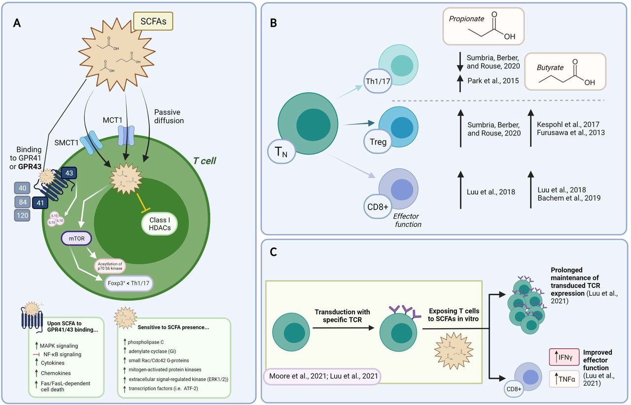 SCFAs가 T 세포 표현형 및 기능을 형성하는 능력에 대한 체외 및 체내 증거를 강조하며,