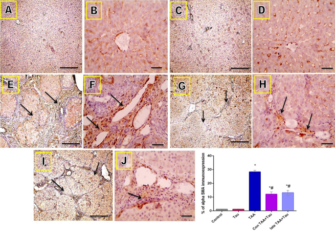 Microscopic pictures of immunostained liver sections against α-SMA. (A) control group. (B) Tau group. (C) TAA group. (D) Con TAA + Tau group. (E) late TAA + Tau group. (F) % of α-SMA immunoexpression. α-SMA: alpha smooth muscle actin. (A,C,E,G,I): X: 100 bar 100., (B,D,F,H,J) X: 400 bar 50. *: Significance against control group (P < 0.05), #: Significance against TAA group (P < 0.05).