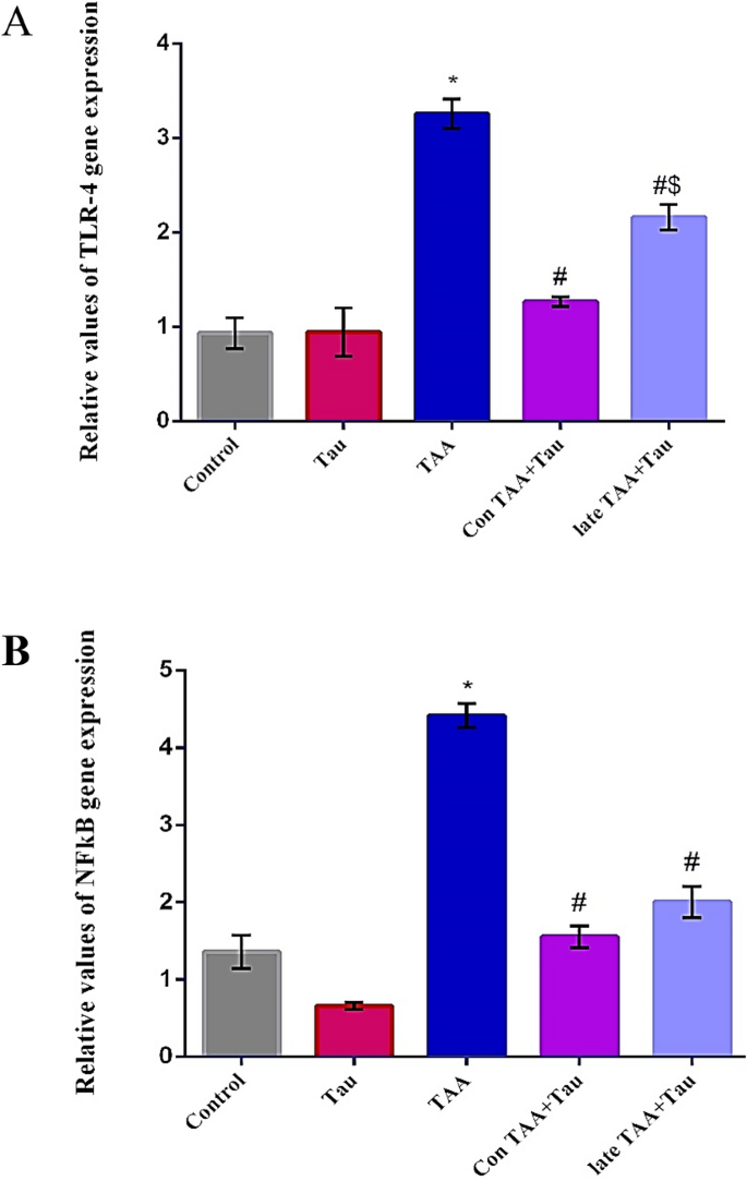 The levels of TLR-4 and NFκB were significantly upregulated in the TAA group compared to the control group. A significant downregulation of TLR-4 and NFκB levels was observed in both taurine treated groups in comparison with the TAA group. The relative expression of TLR-4 decreased significantly in the Con TAA + Tau group compared to the late TAA + Tau group, as shown in Fig. 3.