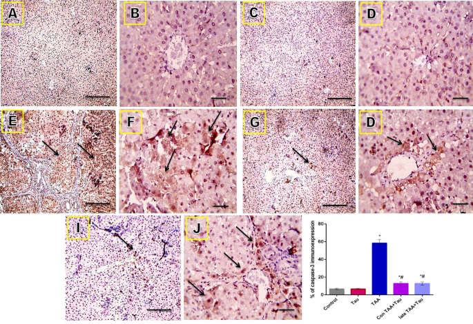Microscopic pictures of immunostained liver sections against caspase-3. (A) control group. (B) Tau group. (C) TAA group. (D) Con TAA + Tau group. (E) late TAA + Tau group. (F) % of caspase-3 immunoexpression. (A,C,E.G,I) X: 100 bar 100. (B,D,F,H,J) X: 400 bar 50. *: Significance against control group (P < 0.05), #: Significance against TAA group (P < 0.05).