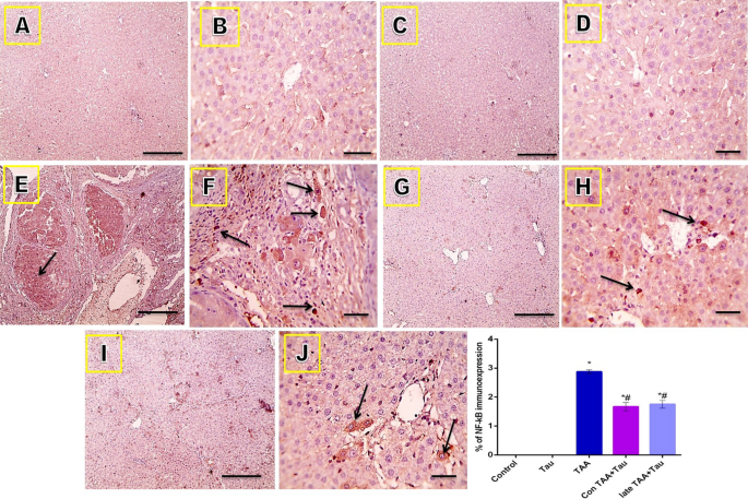 Microscopic pictures of immunostained liver sections against nuclear factor kappa B. (A) control group. (B): Tau group. (C) TAA group. (D) Con TAA + Tau group. (E) late TAA + Tau group. (F) % of NF-kB immunoexpression. (A,C,E.G,I) X: 100 bar 100. (B,D,F,H,J): X: 400 bar 50. *: Significance against control group (P < 0.05), #: Significance against TAA group (P < 0.05).