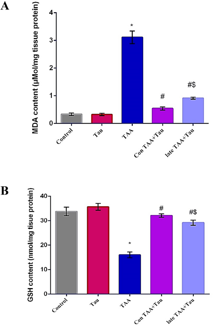 A significant rise in malondialdehyde (MDA) levels was observed in the TAA group compared to the control group. This rise was accompanied by a significant depletion in hepatic GSH content, compared with the control group. Concomitant and late taurine treatment produced significant reductions in MDA level and a marked increase in hepatic GSH content compared to the TAA group. The Con TAA + Tau group had significantly decreased MDA content, and significantly increased GSH content compared to the late TAA + Tau group, as shown in Fig. 1.