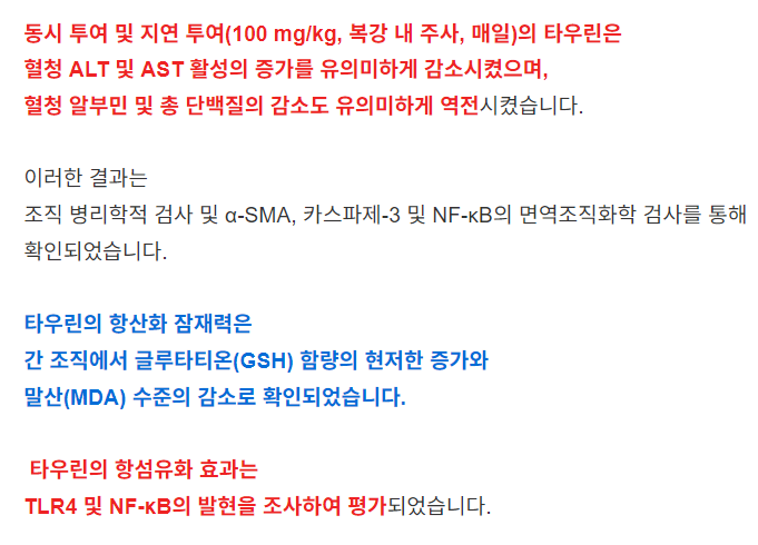 타우린은 간 손상을 예방하는 간 보호제로 작용하며26,