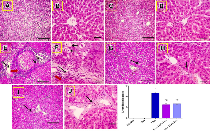 Microscopic pictures of H&E stained liver sections. (A) control group. (B) Tau group. (C) TAA group. (D): Con TAA + Tau group. (E) late TAA + Tau group. (F) liver fibrosis score. (A,C,E,G,I) X: 100 bar 100. (B,D,F,H,J) X: 400 bar 50. *: Significance against control group (P < 0.05), #: Significance against TAA group (P < 0.05).