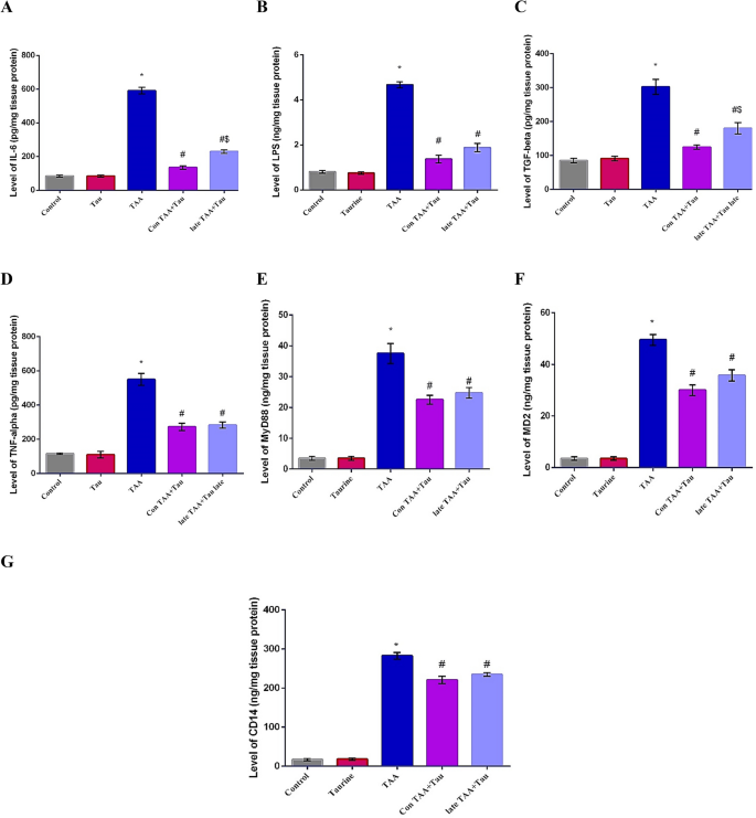 본 연구에서 TAA로 처리된 쥐의 간 조직 추출물에서 IL-6, LPS, MyD88, MD2, CD14, TGF-β1 및 TNFα의 수준을 측정했으며, 일부 쥐는 타우린을 동시에 또는 후속 그룹에서 투여받았습니다. 간 TLR-4 및 NFκB의 상대적 발현은 qRT-PCR을 사용하여 평가되었습니다. TAA 그룹은 대조군에 비해 IL-6, LPS, MyD88, MD2, CD14, TGF-β1 및 TNF-α의 수준이 유의미하게 증가했습니다. 타우린을 투여한 두 그룹 모두 TAA 그룹에 비해 IL-6, LPS, MyD88, MD2, CD14, TGF-β1 및 TNF-α의 수준이 감소했습니다. IL-6 및 TGF-β1 수준은 Con TAA + Tau 그룹에서 late TAA + Tau 그룹에 비해 유의미하게 감소했으며, 이는 그림 2에 표시되어 있습니다.
