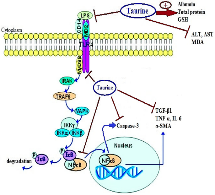 Taurine modulates toll like receptors 4/nuclear factor kappa B signaling pathway. GSH: reduced glutathione, ALT: alanine aminotransferase, AST: aspartate aminotransferase, MDA: malondialdehyde, LPS: lipopolysaccharides, TLR4: toll like receptor 4, MD2: myeloid differentiation protein 2, MyD88: Myeloid Differentiation primary response protein, CD14: cluster of differentiation 14, IRAK: IL-1 receptor associated-kinase, TRAF6: tumor necrosis factor receptor-associated factor-6, MAPK: mitogen-activated protein kinase, IKK: I kappa B kinase complex, NF-kB: nuclear factor-kB, IL-6: interleukin-6, TGF-β1: transforming growth factor β1, TNF-α: tumor necrosis factor-α, α-SMA: alpha smooth muscle actin.