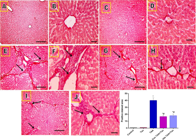 Microscopic pictures of Sirius red stained liver sections. (A) control group. (B): Tau group. (C) TAA group. (D) Con TAA + Tau group. (E) late TAA + Tau group. (F) positive stained area. (A,C,E.G,I) X: 100 bar 100. (B, D,F,H,J) X: 400 bar 50. *: Significance against control group (P < 0.05), #: Significance against TAA group (P < 0.05).