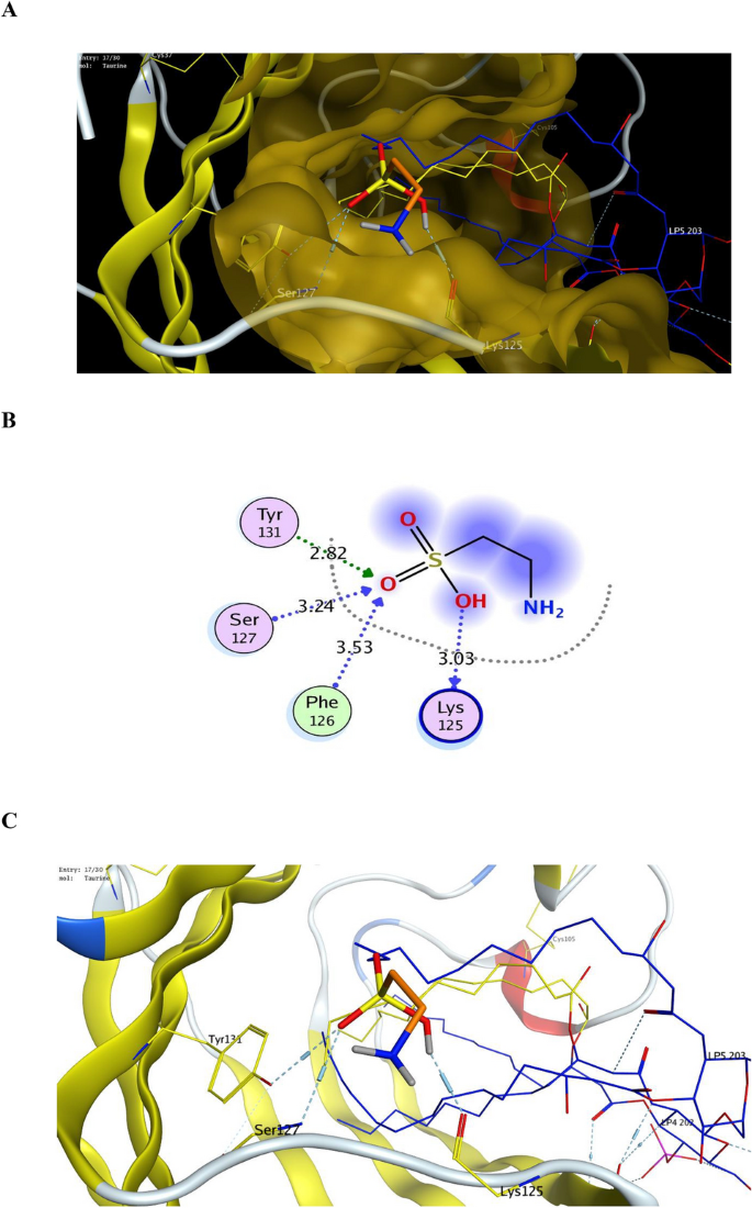 Analysis of the docking results showed that taurine could be fitted into the hydrophobic binding pocket of MD2 within less than 0.3 Å RMSD where the docking score of best docked pose was 7.63 kcal mol−1, as shown in Fig. 9A. In order to have good results we performed a series of docking simulations using TLR4/MD2 complex (pdb code: 4G8A). We selected a large docking search area that contained the entire LPS binding pocket in MD2 which has a β-cup fold structure composed of two antiparallel β-sheets separated from each other forming a hydrophobic pocket. Looking closely at amino acid interactions between taurine and the pocket site, we found that the ligand was in contact with the phenyl rings of Tyr131 and Phe126, which move into this position upon binding. The polar interactions with the two amino acids in the binding site Tyr131 and Phe126 were at bond lengths of 2.82 and 3.53 A°, respectively. We also found hydrogen bond interaction with the basic amino acid Lys125 and another polar interaction with Ser127 of the binding site of MD2, as shown in Fig. 9B,C.
