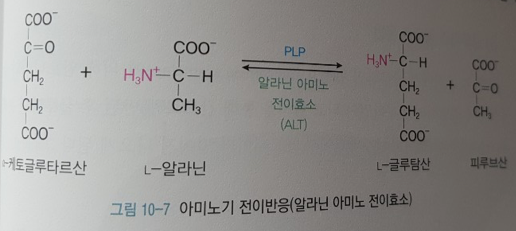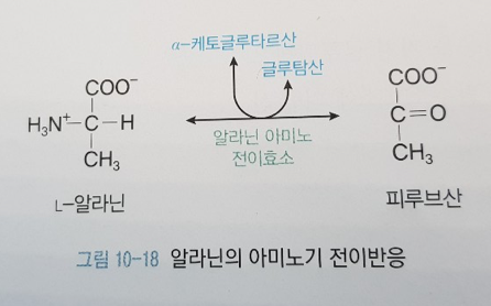 알라닌의 아미노기를 알파-케토글루타르산에 전달하여 글루탐산을 생성하고 알라닌은 아미노기를 잃어서 피루브산이 됨.