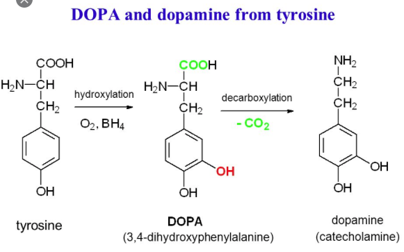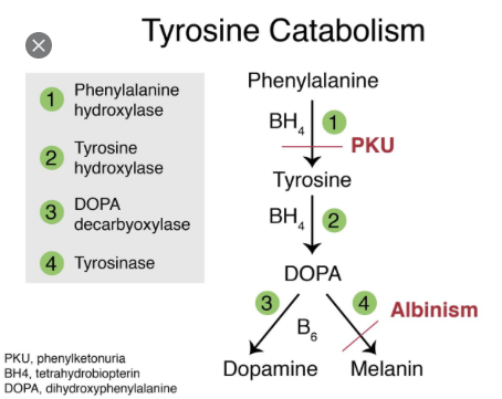 # 페닐알라닌 - 티로신 전구체 - L-도파, 노르에피네프린, 페닐케톤뇨증과 관련 있음.
