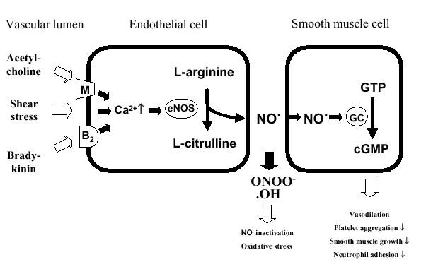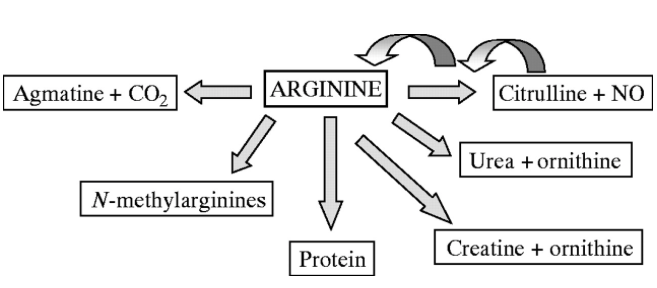 일산화질소(Nitric oxide, NO)는 아르기닌으로부터 합성되며 혈관확장, 혈소판 응집저해 등의 역할을 함.