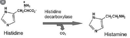 히스타민은 히스티딘에서 탈카르복실화효소에 의해 카르복실기가 제거되어 생성됨. 알레르기, 염증반응, 위산분비에 영향을 줌.