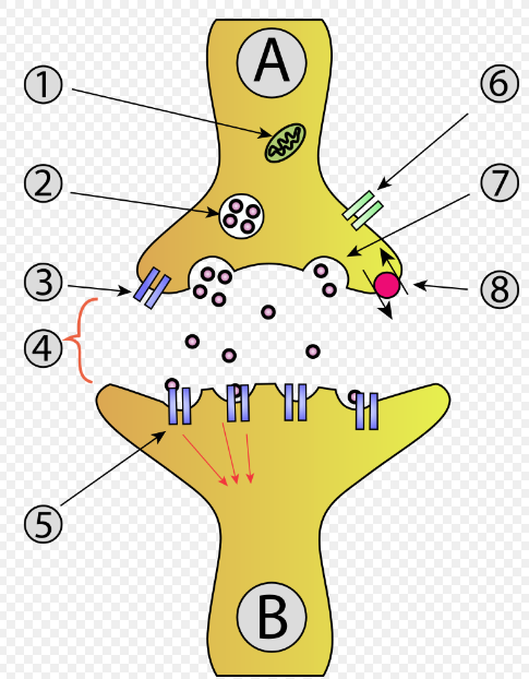 Features: 1. Mitochondrion. 2. synaptic vesicle with neurotransmitters. 3. Autoreceptor. 4. Synapse with neurotransmitter released (serotonin). 5. Postsynaptic receptors activated by neurotransmitter (induction of a postsynaptic potential). 6. Calcium channel. 7. Exocytosis of a vesicle. 8. Recaptured neurotransmitter.
