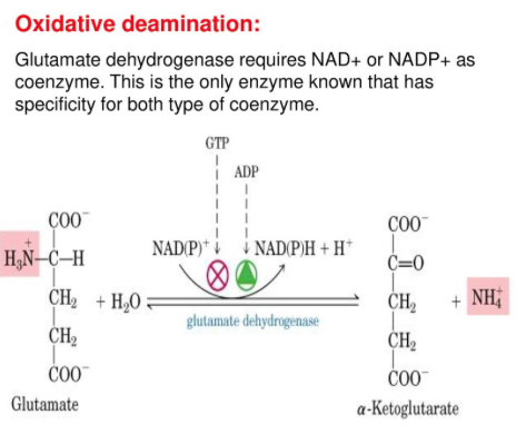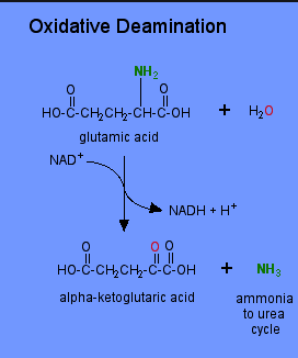 글루탐산 탈수소효소(Glutamate dehydrogenase)에 의해 산화적 탈아미노반응이 일어남. 이 반응은 산화반응이기 때문에 전자 또는 수소 수용체로 NAD+와 같은 조효소가 필요함.