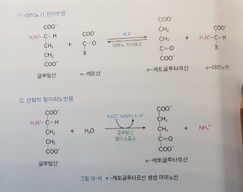 아미노산의 알파-아미노기 제거는 산화적 탈아미노반응(deamination)과 아미노기 전이반응(transamination)에 의해 이루어짐.