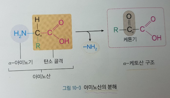아미노산이 분해되기 위해서는 먼저 알파-탄소에 결헙되어 있는 아미노기(알파-아미노기)가 떨어져 나오는 것임. 이러한 과정은 탈아미노 반응(deamination)을 거쳐 암모니아로 떨어져 나오거나 아미노전이효소에 의해 알파-케토산으로 전이됨으로써 이루어짐. 아미노산 구조에서 알파-아미노기가 떨어져 나가면서 남은 탄소골격의 알파-탄소에는 산소가 결합하여 케톤기가 생기고 알파-케토산으로 바뀜.