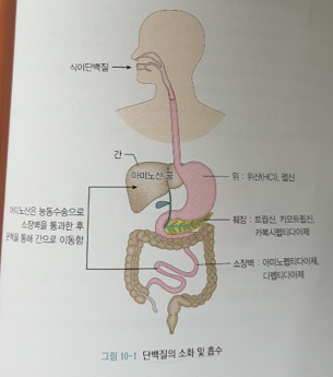 체내로 들어온 단백질은 아래 그림과 같은 과정을 거쳐 소화 및 흡수됨