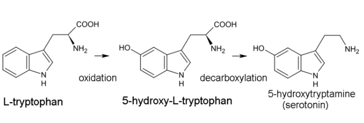 L-tryptophan --oxidation -->5-hydroxy-L-tryptophan -- decarboxylation --> serotonin