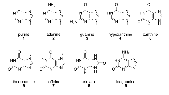 Other notable purines are hypoxanthine (4), xanthine (5), theobromine (6), caffeine (7), uric acid (8) and isoguanine (9).