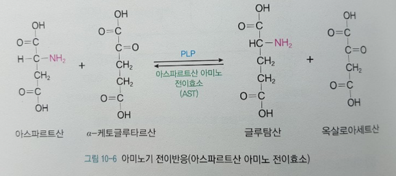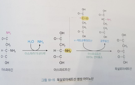 아스파르트산의 아미노기를 TCA회로의 중간물질인 알파-케토글루타르산에 전달하여 글루탐산을 만들고 아미노기를 잃은 아스파트산은 옥살로아세트산이 됨.