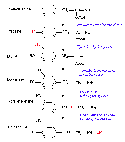 ex) 페닐알라닌 -> 티로신 -> DOPA -> 도파민 > 노르에피네프린 -> 에피네프린