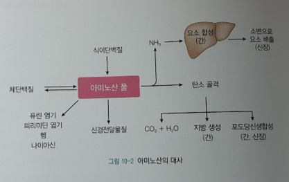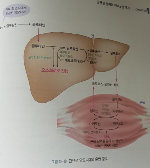 아미노산 대사와 체단백질 분해에서 암모니아는 글루타민과 포도당 알라닌 회로를 이용해 간으로 운반되어 요소로 전환된 후 혈액을 통해 신장으로 이동되어 배설됨.