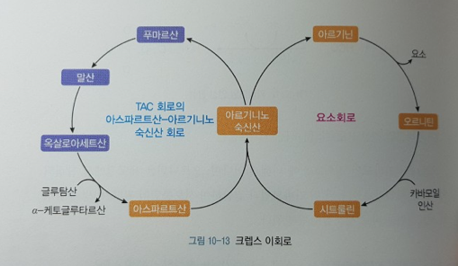 # 요소회로의 중간산물인 푸마르산이 TCA회로를 거치기 때문에 요소회로와 TCA회로는 서로 연결되어 있음.