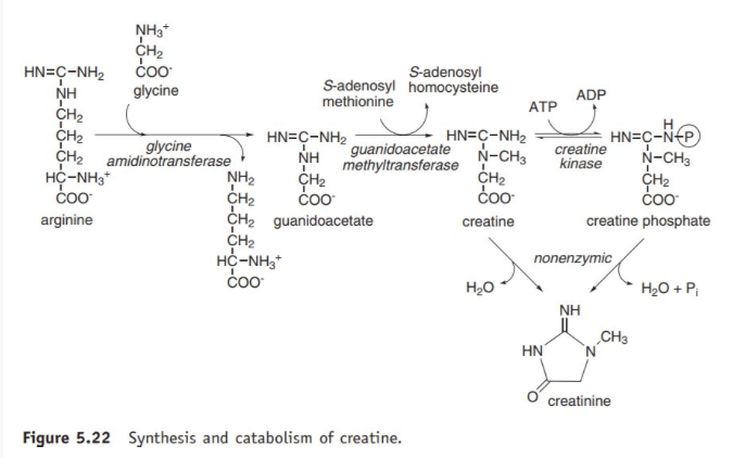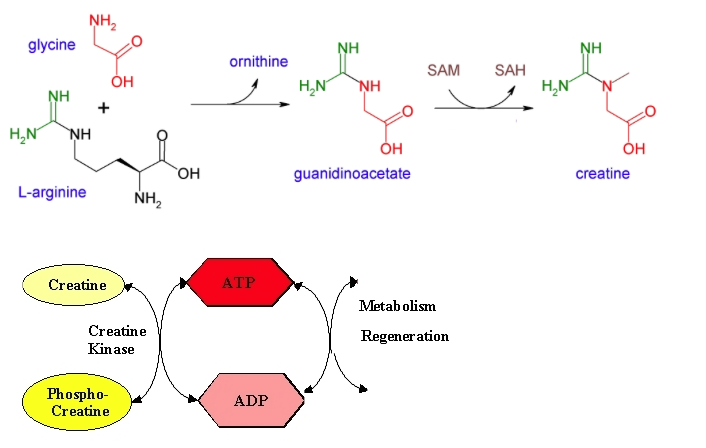 크레아틴 합성은 아르기닌과 글리신이 결합하면서 시작됨. 두 물질이 결합하여 구아니디노아세트산이 되고 여기에 SAM에 의해 메틸화되어 크레아틴이 됨. 크레아틴은 혈액을 통해 뇌와 근육으로 이동하여 크레아틴 키타아제에 의해 ATP가 소모되면서 고에너지 화합물인 크레아틴 인산이 됨.