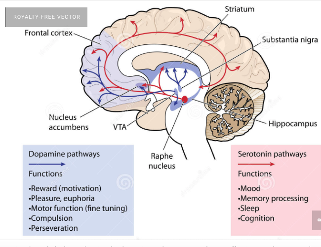 세로토닌은 뇌의 시상하부에서 분비되는 신경전달물질로 트립토판으로부터 합성되며 기분, 체온조절, 수면 등에 영향을 줌.