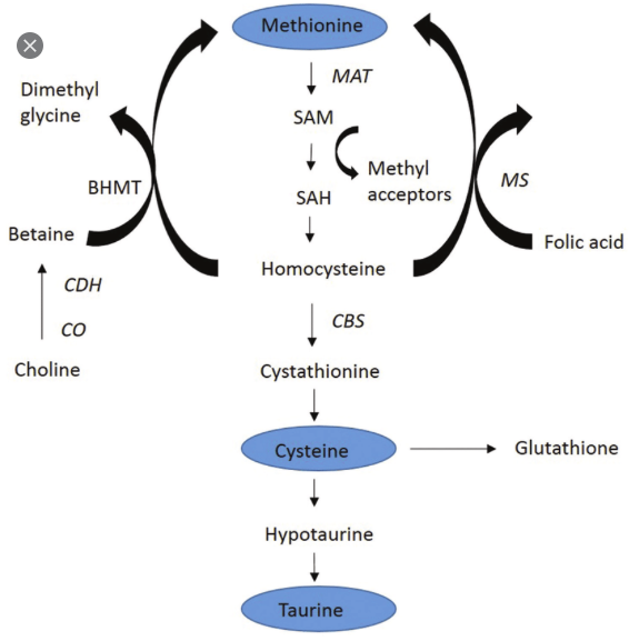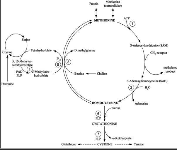 1) 메티오닌 --> SAM --> SAH --> Homocysteine -----(choline -->betaine) --> methione