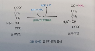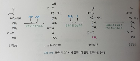 근육외 조직에서 글루타민 합성효소에 의해 암모니아와 글루탐산이 결합하여 글루타민이 되고 혈액을 통해 간으로 운반된 후 글루타민 분해효소에 의해 글루타민에서 암모니아가 떨어져 나옴.