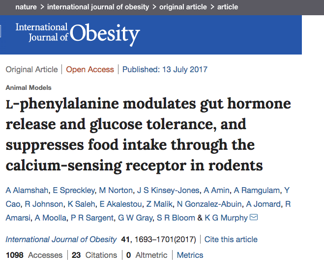 L-Phe reduced food intake, stimulated GLP-1 and PYY release, and reduced plasma ghrelin in rodents. Our data provide evidence that the anorectic effects of L-Phe are mediated via the CaSR, and suggest that L-Phe and the CaSR system in the GI tract may have therapeutic utility in the treatment of obesity and diabetes. Further work is required to determine the physiological role of the CaSR in protein sensing in the gut, and the role of this system in humans.