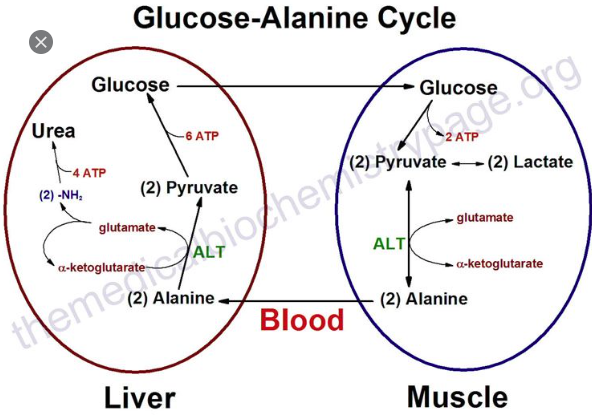 근육에서 글루코스는 해당과정을 거쳐 피루브산이 되고 ALT에 의해서 알라닌이 됨. 근육에 넘쳐나는 알라닌은 혈액을 통해 간으로 전달되어 위 과정을 반복함.