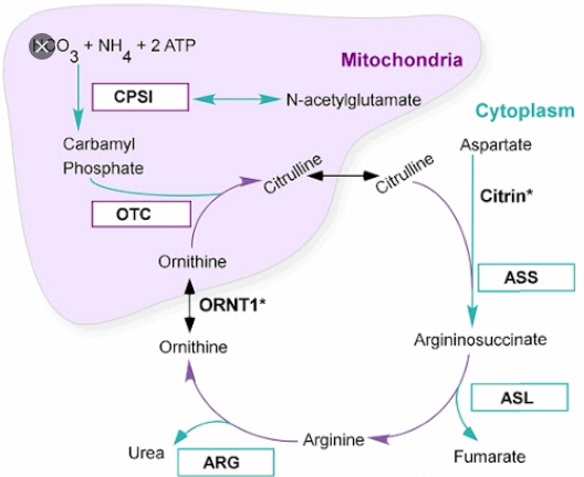 # 이 경로의 효소들은 세포질과 미토콘드리아에 분리되어 존재하기 때문에 초기 두반응은 간세포의 미토콘드리아에 일어나고 나머지 부분은 세포질에서 일어남.